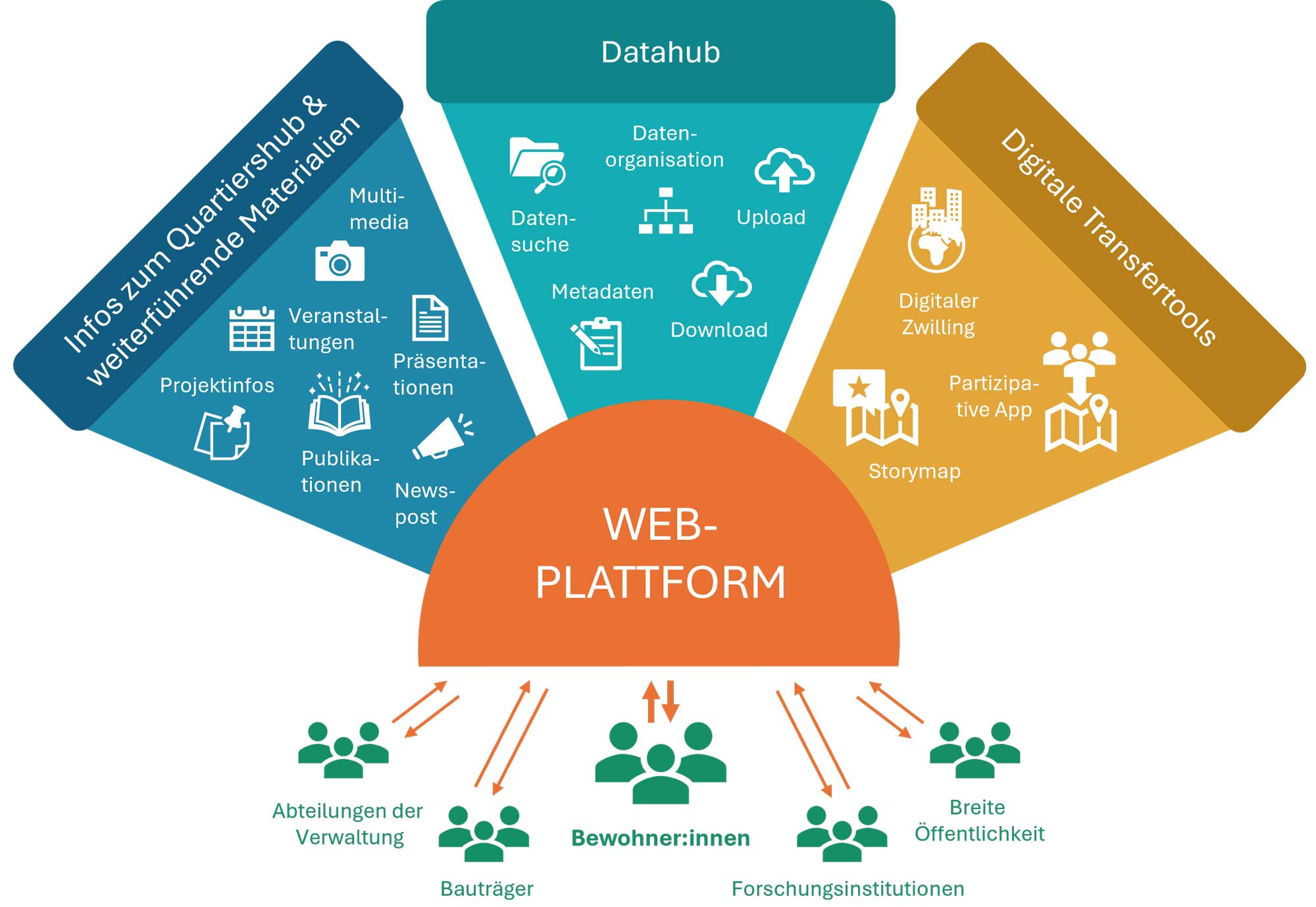 Der gezielte Aufbau von Kapazitäten und Kompetenzen in lokalen Quartiershubs soll die Entwicklung von klimaneutralen und klimaresilienten Quartieren vorantreiben. Die Hubs schaffen ein produktives Umfeld für Innovation, Demonstrationen, Vernetzung, Monitoring, Datenmanagement, Forschung und Wissenstransfer. Sie dienen als Drehscheibe für alle relevanten Akteur:innen, ermöglichen die Umsetzung von FTI-, Demonstrations- und Umsetzungsprojekten, das Lernen und Experimentieren im Praxiskontext sowie den Wissenstransfer an andere Stadtquartiere.